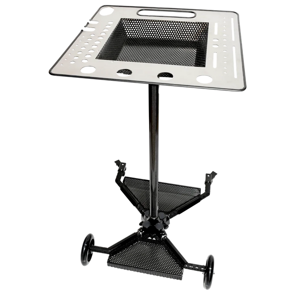 Gefertigt aus hochwertigem Aluminium und verstärktem Stahl bietet der DJ Cart außergewöhnliche Haltbarkeit bei gleichzeitig geringem Gewicht für einfachen Transport zwischen Einsätzen. Die stabile Rollenbasis und das ergonomisch höhenverstellbare Design ermöglichen komfortables und effizientes Arbeiten über den gesamten Tag hinweg.