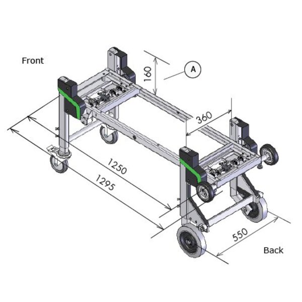 - Una struttura mobile le cui gambe possono essere estese e richiuse in modo automatico durante il carico e lo scarico. Sul telaio possono essere installati vari moduli aggiuntivi, come ad esempio cassette per gli attrezzi o parti, un piano da lavoro e / o vari macchinari ed attrezzature fino a un peso massimo di 250 kg.