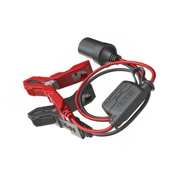 - On one side of the Noco cable are crocodile clips that you can attach to the battery poles. On the other side of the cable is a 12V cigarette plug connection.