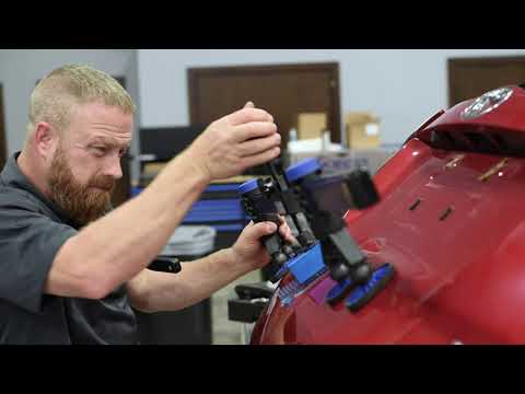 Der KECO K-Beam Brückenheber bietet kontrollierte Kraft und Hebelwirkung, um große Dellen aus Paneelen, Türen, Nähten und Karosserielinien zu ziehen. Der gleichbleibende Zugdruck ermöglicht es den Technikern, die Delle aus verschiedenen Winkeln zu betrachten und die Erhebungen anschließend gezielt zu glätten.