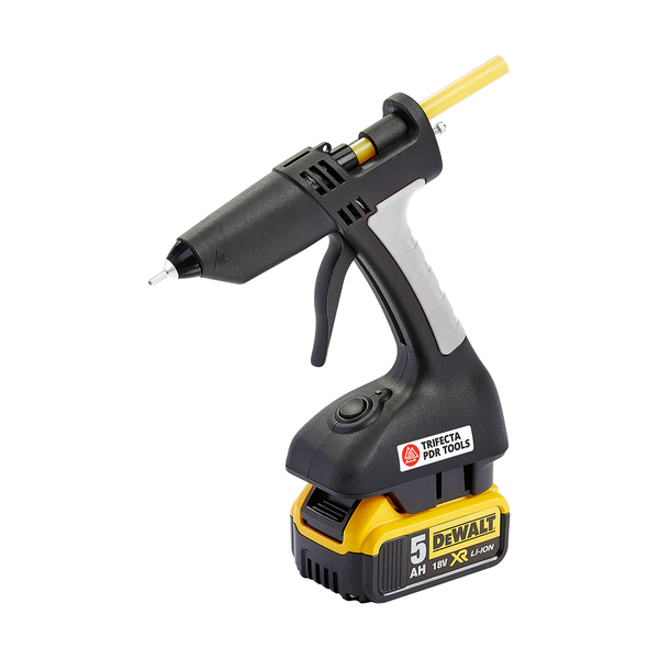 The Trifecta Trigger glue gun comes was designed with a dual temperature switch. The glue gun accepts adapters for DeWalt battery.